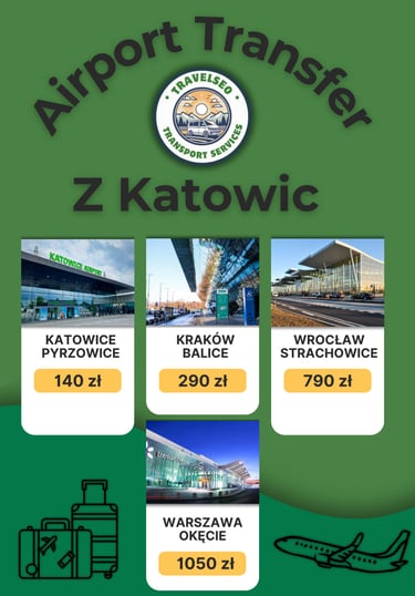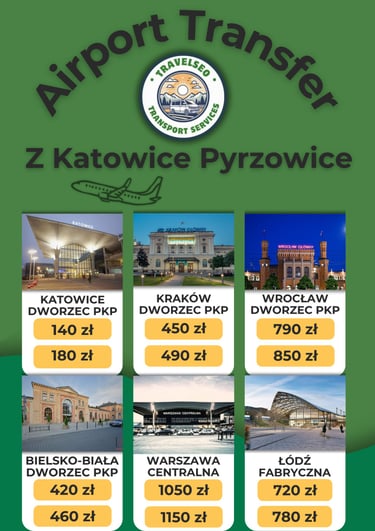 *Cena dotyczy przejazdu z Katowic Pyrzowic do dworca PKP podanych miast. Trasa pod inny adres - cena ustalana indywidualnie.