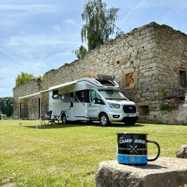 ✅ Pełne wyposażenie kampera (garnki, sztućce, kubki, chemia toaletowa)